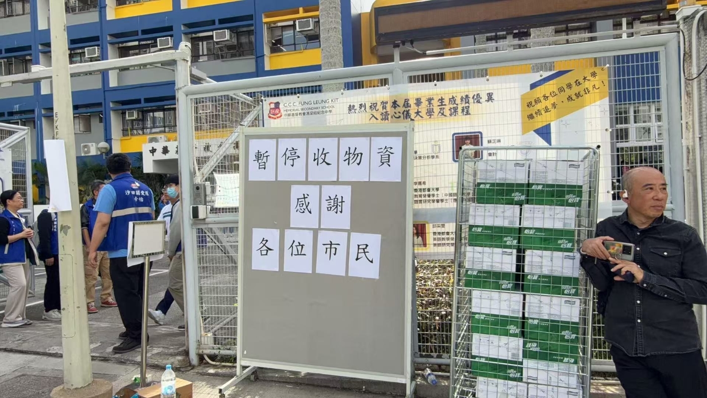 中心外貼出公告,感謝市民,暫時停收物資。臨時中心所在的中學校園內,堆滿熱心市民捐贈的物資。  (完)