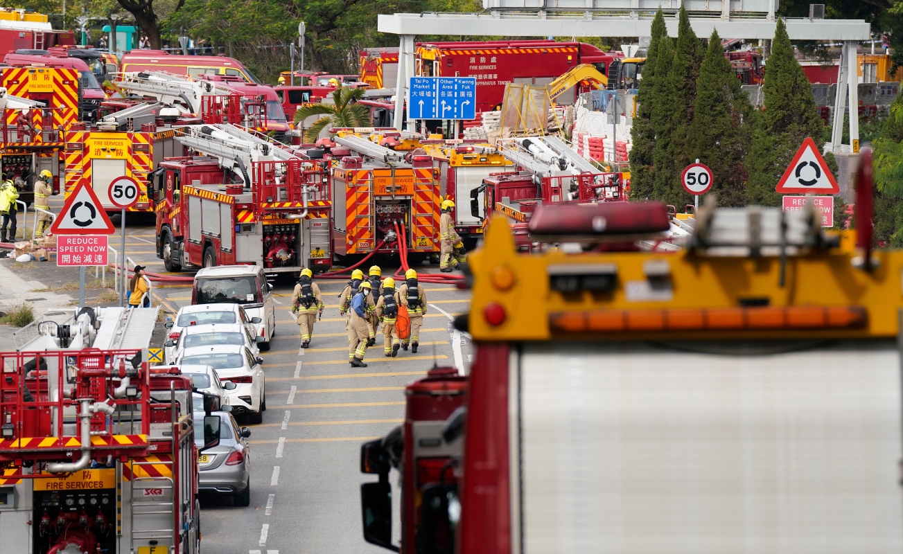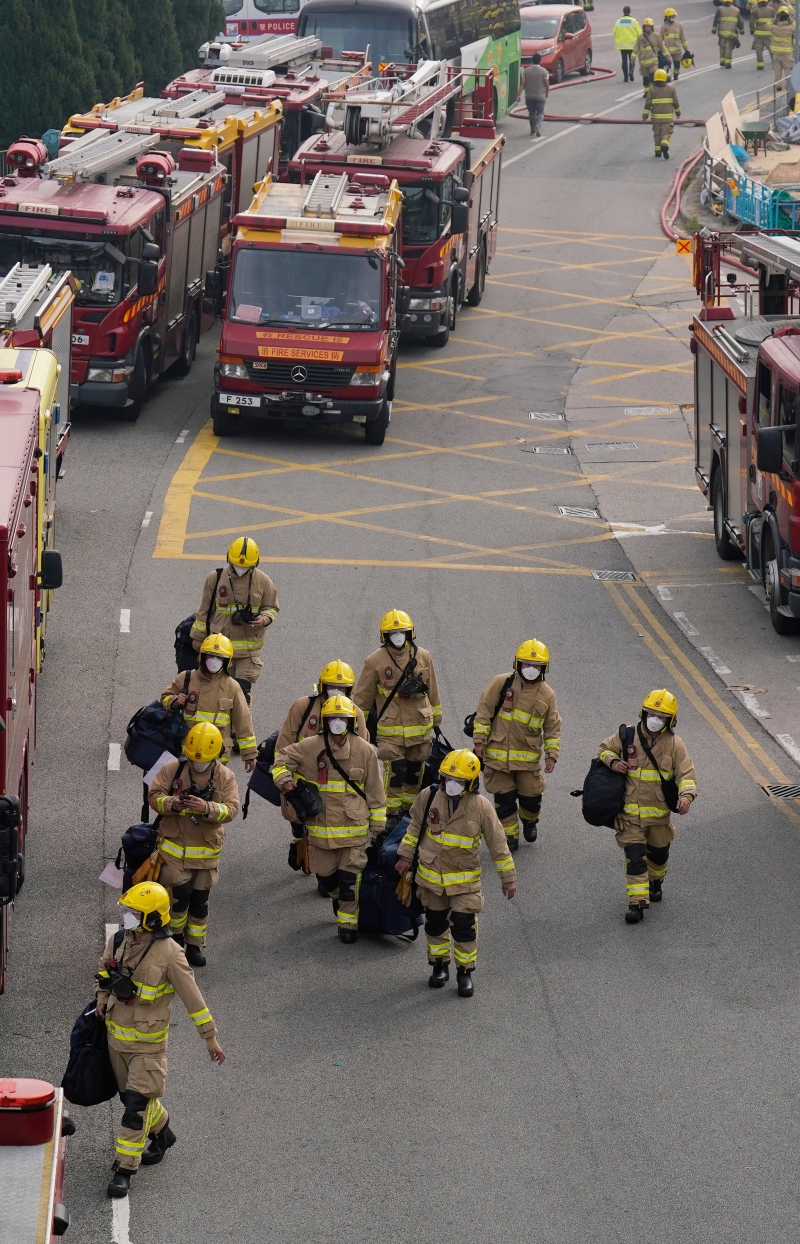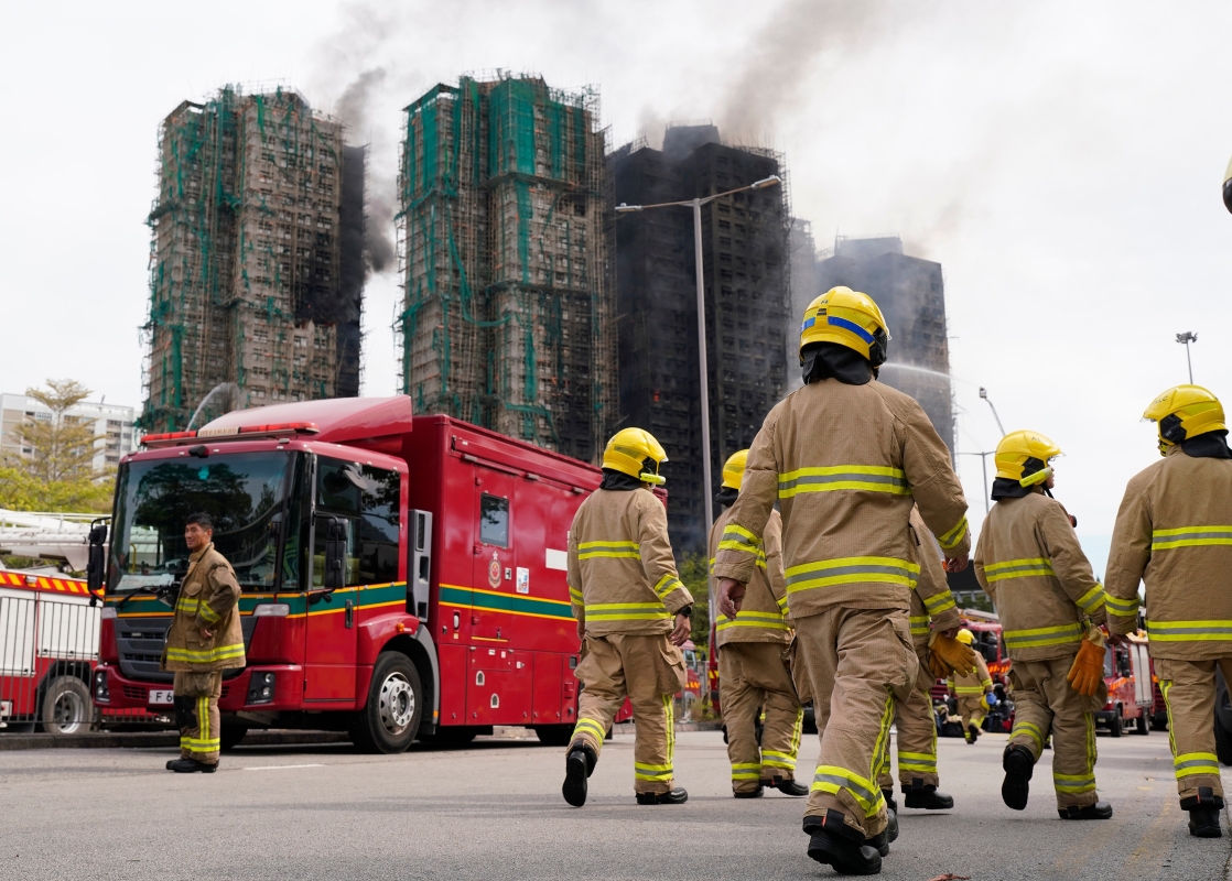 香港大埔宏福苑26日發生五級大火,至27日消防人員仍在撲滅火勢。
