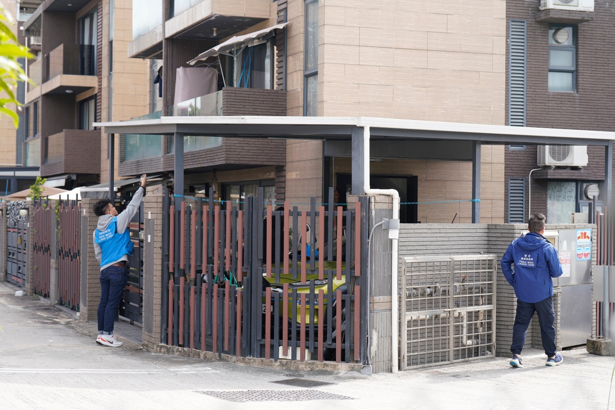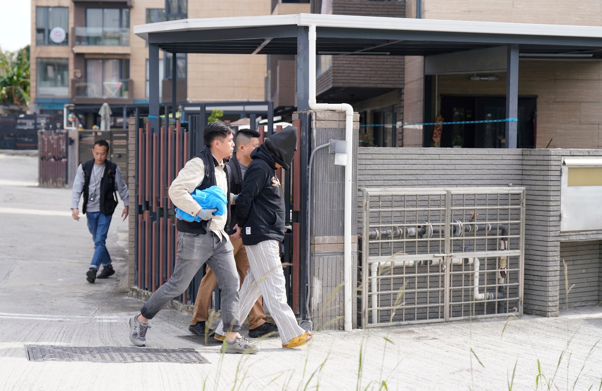 香港新聞網11月27日電(圖文陳奕啟 攝)11月27日下午,香港警方就大埔火警,帶涉事相關人員到朗庸園路121號蝦尾新村搜證。26日大埔宏福苑五級火死亡人數增至44人。警方凌晨拘捕3名負責屋苑大廈維修的工程公司負責人,包括兩名董事及一名工程顧問扣查。初步調查顯示,涉事屋苑正進行維修工程,懷疑有人使用未符合防火標準的外牆保護網、防水帆布及塑膠布等,人員亦發現涉事大廈有窗戶懷疑被安裝發泡膠板。新界北總區重案組正積極調查案件。
