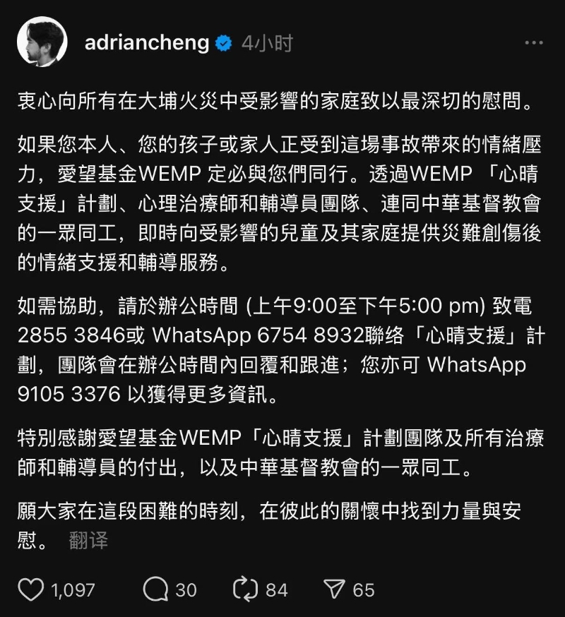 愛望基金創辦人鄭志剛表示,如果您本人、您的孩子或家人正受到這場事故帶來的情緒壓力,愛望基金定必與您們同行。透過愛望基金“心晴支援”計劃、心理治療師和輔導員團隊、連同中華基督教會的一眾同工,即時向受影響的兒童及其家庭提供災難創傷後的情緒支援和輔導服務。 如需協助,請於辦公時間(上午9:00至下午5:00) 致電2855 3846或WhatsApp 6754 8932聯络“心晴支援”計劃,團隊會在辦公時間內回覆和跟進,您亦可 WhatsApp9105 3376 以獲得更多資訊。 特別感謝“心晴支援”計劃團隊及所有治療師和輔導員的付出,以及中華基督教會的一眾同工。願大家在這段困難的時刻,在彼此的關懷中找到力量與安慰。(完) 【編輯:譚暢】