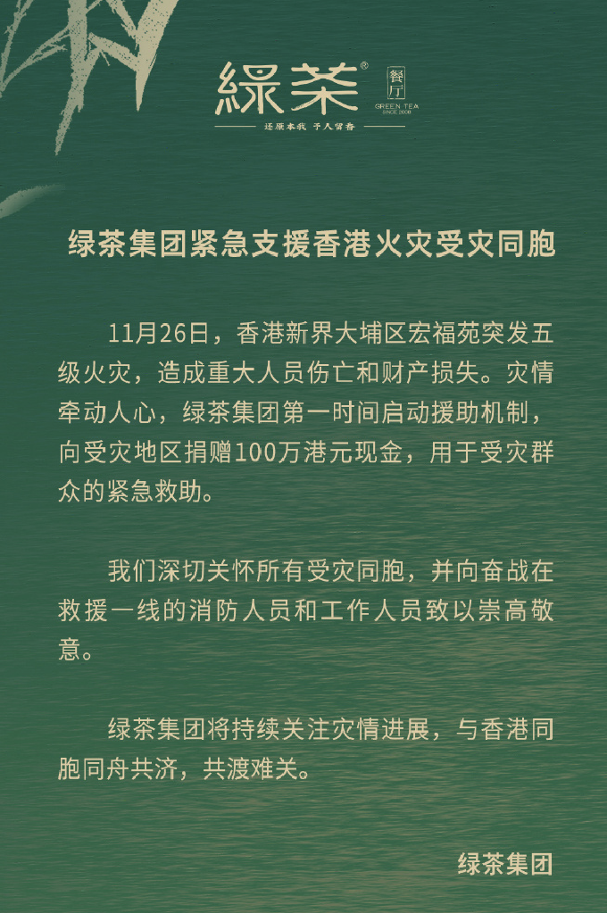 綠茶集團捐100萬港元馳援香港大埔火災救援分享到:
