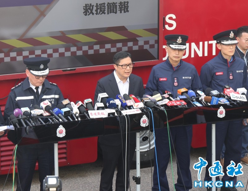 11月28日,保安局局長鄧炳強會見傳媒。香港中通社資料圖片 保安局局長鄧炳強28日會見傳媒時表示,初步化驗了宏福苑大廈的棚網、保護網,發現其達到阻燃的要求,但包圍大廈窗戶的發泡膠板(泡沫板)是高度易燃的。他指出,相信最初起火的位置是宏昌閣低層外面的圍網,其後由於燃燒了發泡膠板,火勢迅速向上蔓延,伸延到多個樓層,並在短時間內波及其他6棟樓宇,大火引燃了貼在窗戶上的發泡膠板,令玻璃爆破,導致火勢急速增強,並且迅速蔓延到室內。