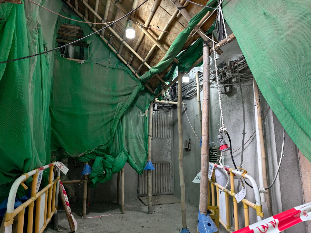 11月28日,正在進行大維修的穗禾苑。香港新聞網記者 梁嘉軒攝 記者28日到位於離宏福苑約半小時車程、正進行大維修的穗禾苑。與發生火災的宏福苑一樣,在香港不少有“苑”的都是居屋,市民在政府資助下可以用低至六折價格購入,但賣出時則需要補地價,防止炒賣,因此這些居屋都是市民購入長期居住的。根據政府要求,超過30年的住宅需要在官方驗證後進行需要的外牆維修工程,業主動輒需要分攤十幾萬的費用。穗禾苑依山而建,共9棟,目前除一棟正在進行棚架拆除作業外,其餘大廈均整棟被包著綠網的棚架包圍。而在大廈的樓梯間和走廊,也堆滿了竹棚和綠色圍網。