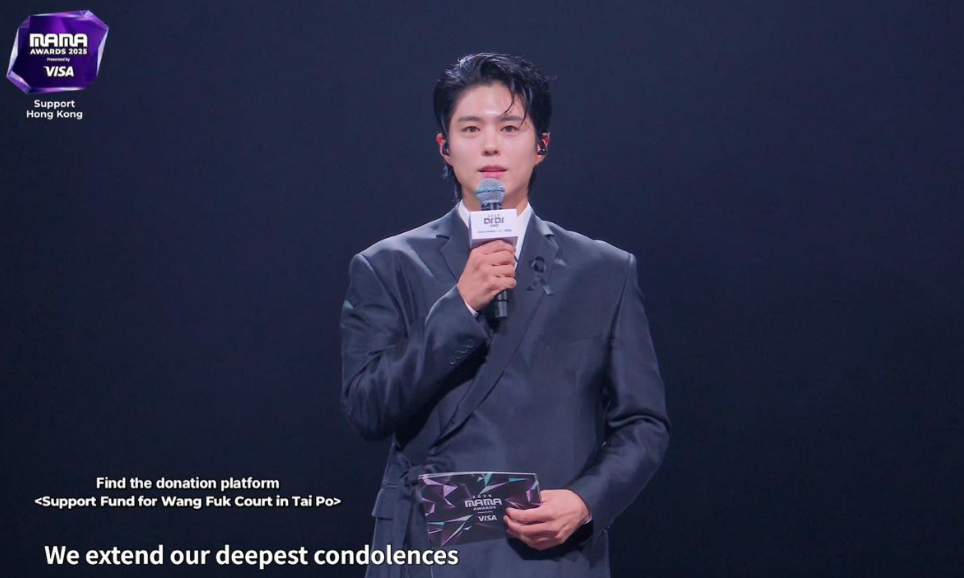 香港新聞網11月28日電 K-pop音樂盛典“2025 MAMA AWARDS”在活動開始前進行默哀儀式,傳播“支持香港”的信息。2025 MAMA AWARDS 28日在香港揭幕,主持人朴寶劍在活動開始,戴上黑絲帶,代表大會對受香港大埔火災影響的市民及失去親人的家庭致以深切慰問,並進行默哀儀式,願沒有人再受傷害。
