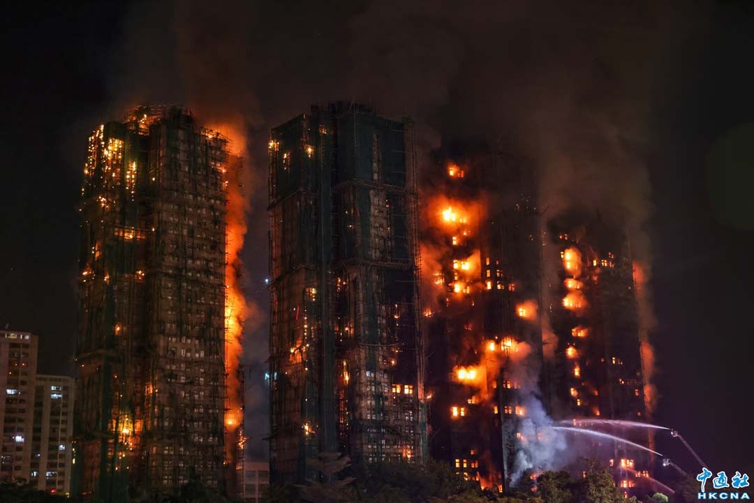 11月26日下午,香港新界大埔一個住宅小區發生火警,火勢迅速漫延,入夜後現場7棟大廈陷入火海。(香港中通社記者 謝光磊 攝)
