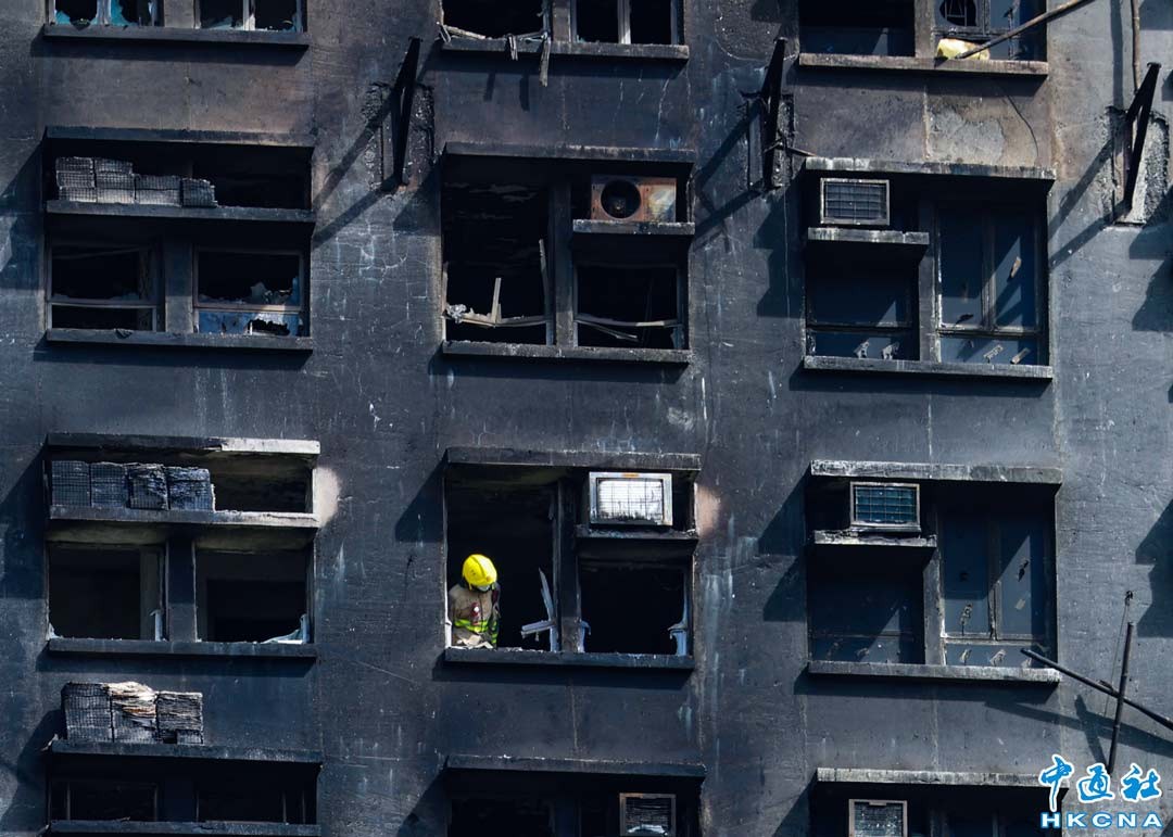 11月29日中午,香港大埔宏福苑火災現場。警方災難遇害者辨認組(認屍組)600多人抵達現場,隨即上樓搜證。(香港中通社記者 鄧梓傑 攝)