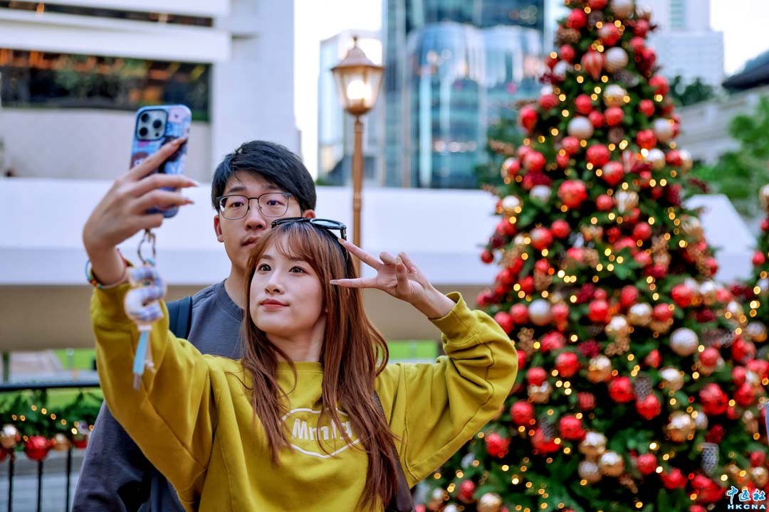 香港旅發局年度盛事“香港繽紛冬日巡禮”,今年重返中環舉行。11月25日,香港中環皇後像廣場花園和遮打道分別化身為“聖誕天地”及“星光長廊”,設有20米高的聖誕樹、聖誕市集及燈飾裝置,吸引大批市民和遊客參觀。重頭戲“光影匯.中環”將於周五(28日)正式登場,中環8幢地標建築結合立體投影共同演出。(香港中通社記者 謝光磊 攝)