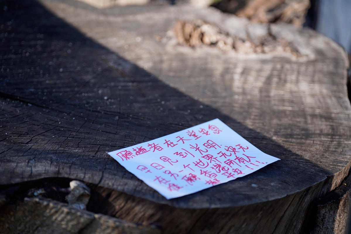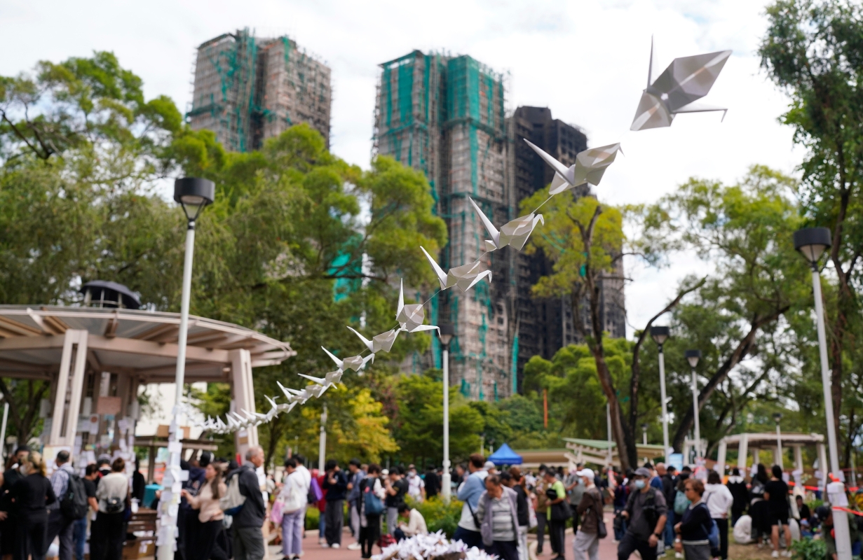 香港新聞網12月2日電( 圖文陳奕啟 ) 12月2日,香港大埔宏福苑火災現場附近的廣福道休憩處繼續有市民排隊到場獻花。涼亭內貼滿悼念紙條,有人摺千紙鶴哀悼逝者。宏福苑五級火造成151人死亡,12月2日是遇難者“頭七” ,火災後的灰燼尚未散盡,空氣仍殘焦灼氣息,現場有家屬路祭,分別有佛教及道教儀式,超度亡靈、撫慰生者,凝聚社會力量共同面對傷痛。