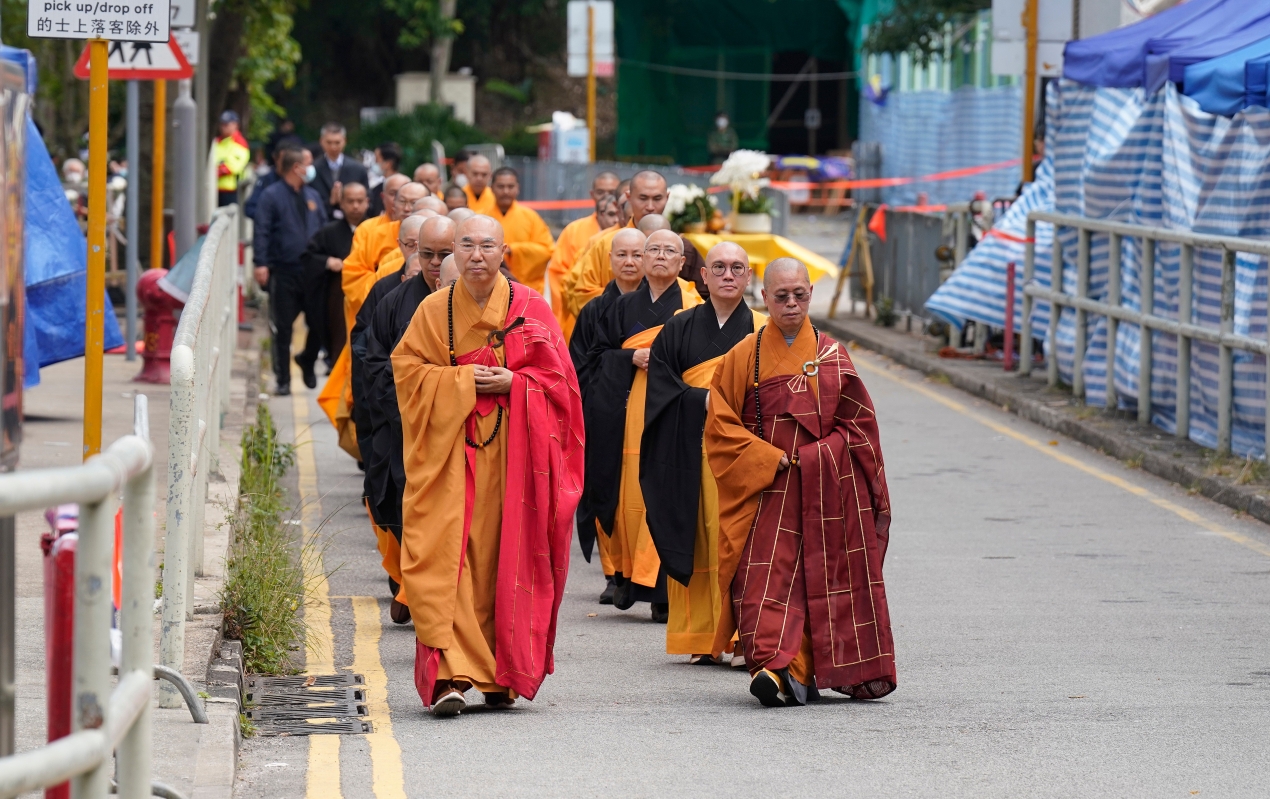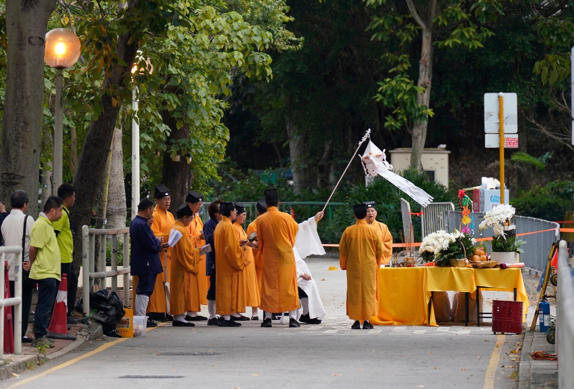 儀式在宏福苑下面一個十字路口舉行,數位佛教僧侶、道教道士相繼誦經,祈願逝者往生極樂、離苦得樂。