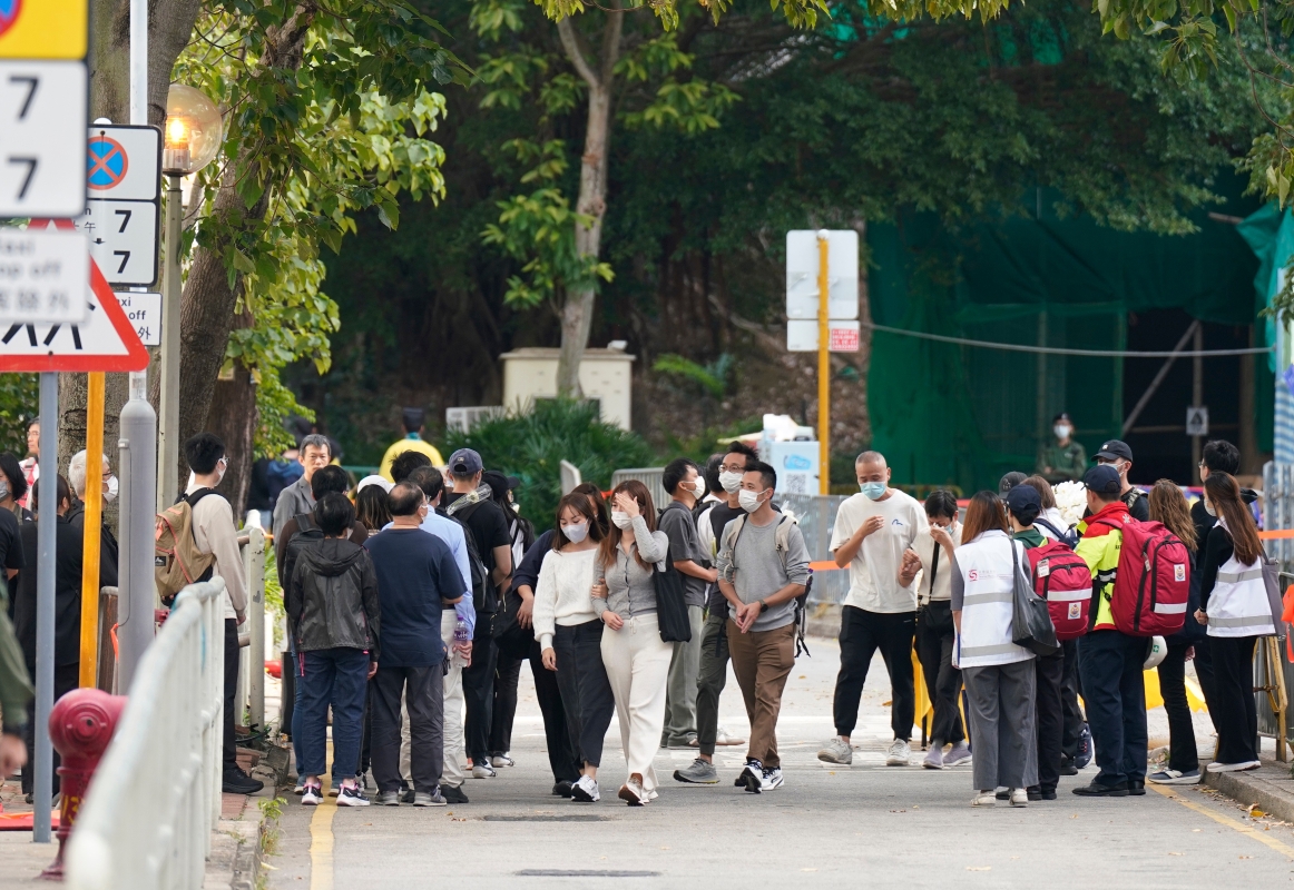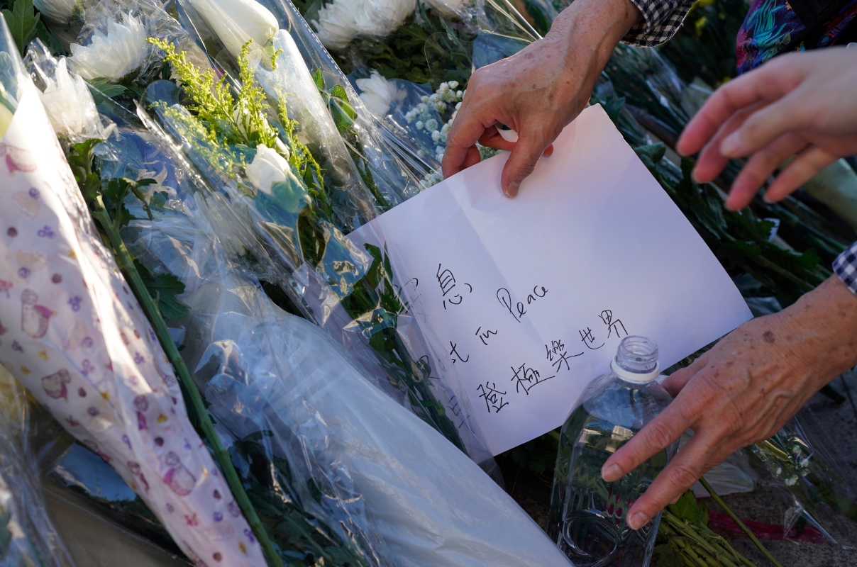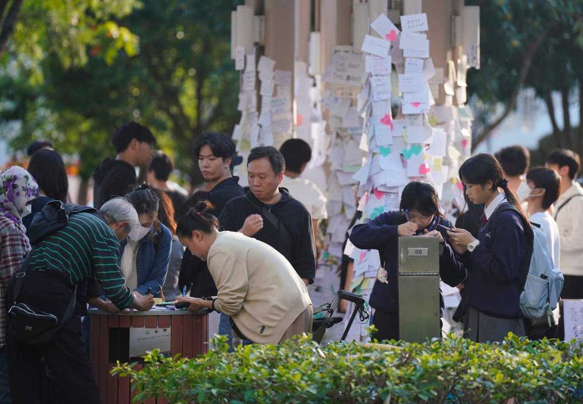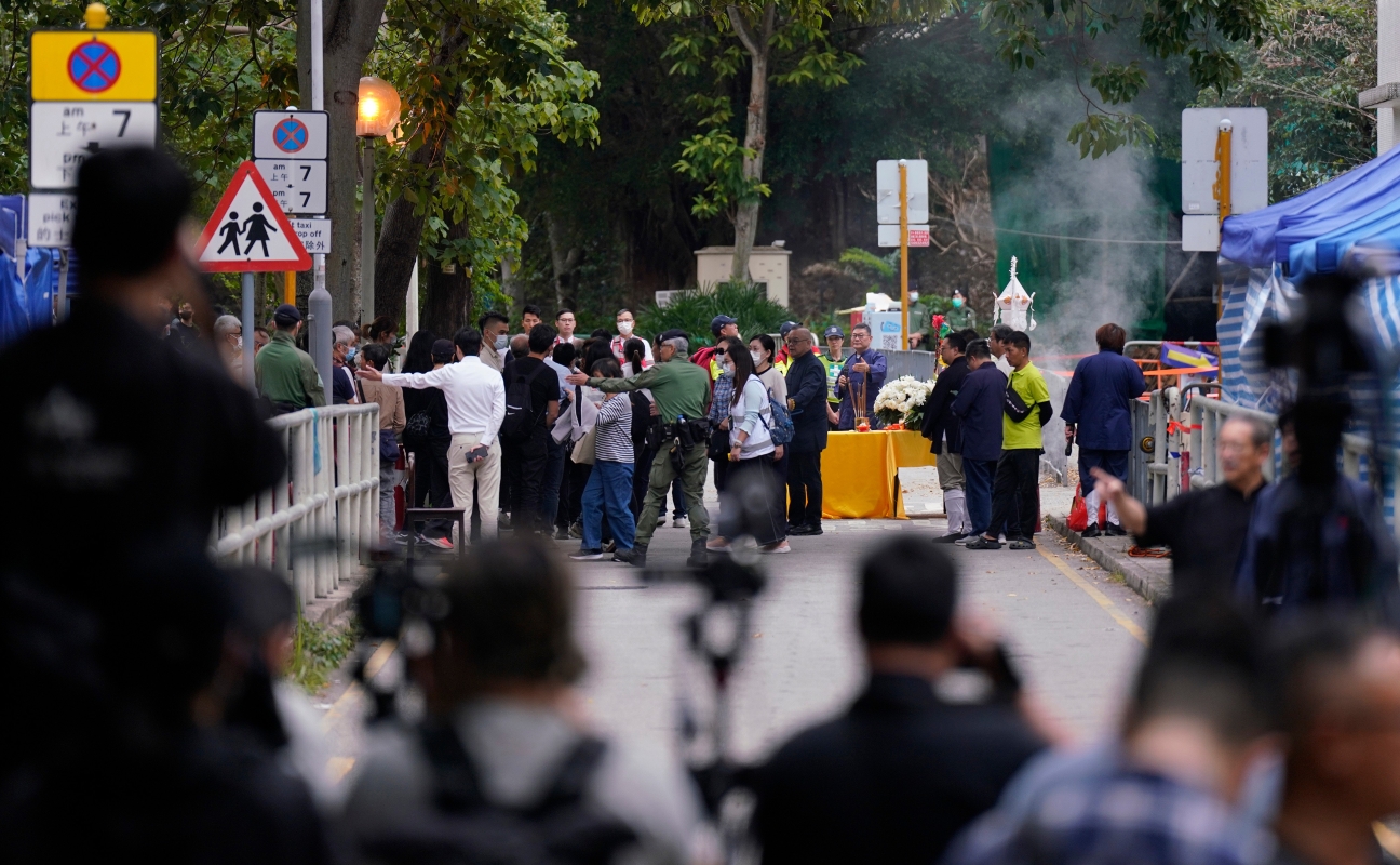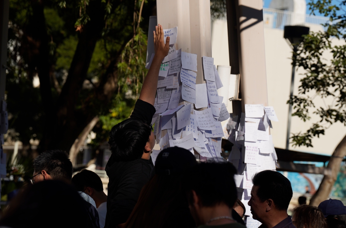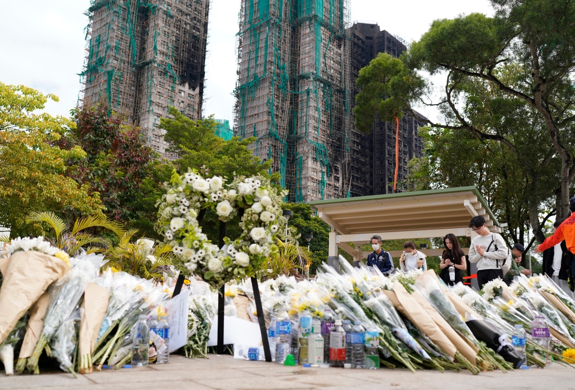 大埔宏福苑火災現場附近的廣福道休憩處繼續有市民排隊到場獻花,