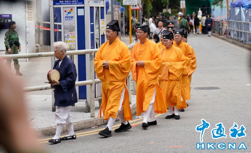 香港中通社圖片 道教和佛教中,習慣上認為“頭七”是人去世後的第六日晚上到第七日早晨,死者魂魄會於“頭七”回家,家人為死者魂魄預備一頓飯,燒香奉祀。 下午2時,儀式在宏福苑下面一個十字路口舉行,數位佛教僧侶、道教道士相繼誦經,祈願逝者往生極樂、離苦得樂。隨後,遇難者家屬代表上前獻花,表達哀思,不少家屬情緒激動。