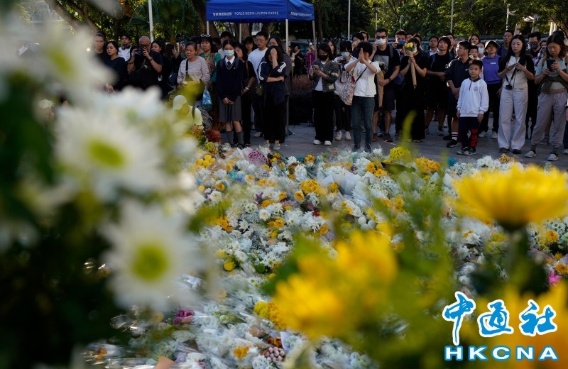 香港中通社圖片 連日來,市民自發到宏福苑樓下花壇獻花,當天來獻花的市民排隊百餘米長,繞過宏福苑前方的大埔河,也有義工在路邊自願分發悼念白菊。悼念者雙手合十,獻花後,默默站在七棟大樓對面,眼含淚光,口中默念祝福。 除了白色黃色的菊花,還有不少有心人獻上毛絨玩具,有市民即場摺紙鶴,草堆上扎滿了黑色和白色紙鶴,休憩處涼亭也貼滿寫有祝福和悼念字句的紙張,向遇難者表達追思。 有前來祭拜人士久久不願離去,選擇一個角落默默對著大樓坐著,希望陪伴受災者度過這一天;有長者自帶誦經的錄音機,獨自坐在花壇邊從早到晚為受災者祈福超度。 火光吞噬了不少“毛孩”的生命。一位年輕志願者牽著一只白色薩摩靜靜站立,手中舉著簡陋的紙牌:免費擁抱,希望為失去寵物的人吊唁。一位女士顫巍巍蹲下,將臉埋進小狗溫軟的頸窩,紅著眼快速離開。 從地鐵站到宏福苑的十分鐘路程,有很多心理支援咨詢信息,希望為有需要的居民提供心理輔導。上面用大字手寫著“有情緒困擾是正常的,合理的。” 住在大埔區的市民黃女士對記者表示,火災給整個社區帶來巨大創傷,這些祭拜和儀式不僅是形式,更是社區療癒的開始。“傷痛需要時間平復,但我們不會孤立面對”。