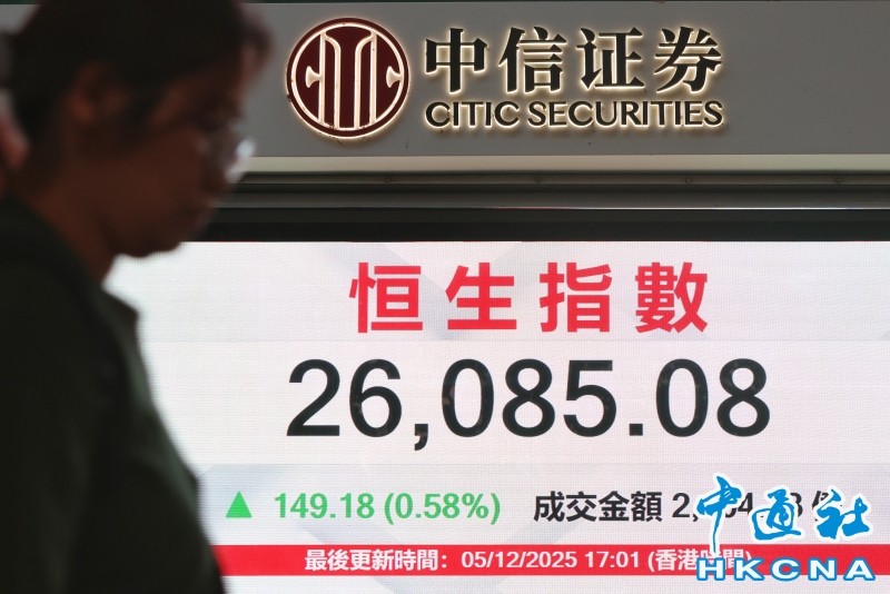 香港中通社12月5日電(記者譚暢)港股5日升149點或0.58%,恆生指數當日收報26085點。大市全日成交額約為2104.7億港元。總結全周,恆指累升226點或0.87%,連續兩周上升。