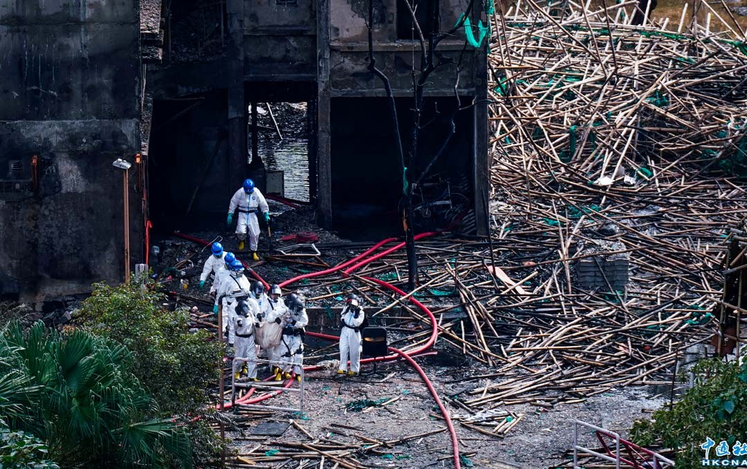 12月1日,香港大埔宏福苑五級火警第六日,警方和消防繼續在現場搜證。(香港中通社記者陳奕啟 攝)