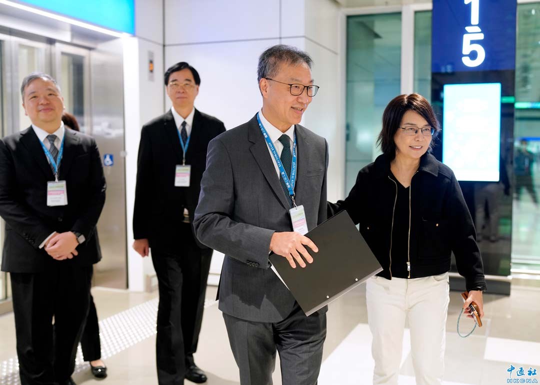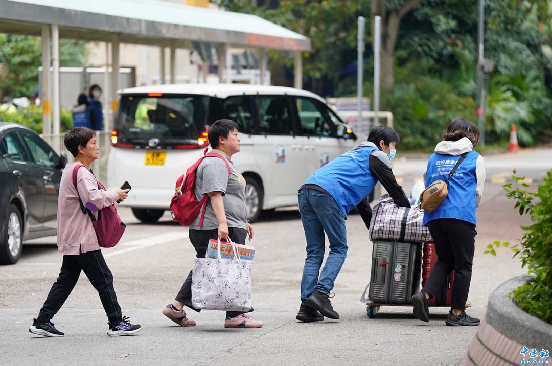 12月3日,大埔宏福苑大火中唯一未被波及的宏志閣,今早在政府安排下,居民陸續返回家中收拾個人物品。每戶可以返回大廈一次,限兩人同時上樓,逗留最多1個半小時。圖為宏志閣居民在政府人員協助下回家取回個人物品。(香港中通社 陳奕啟 攝)