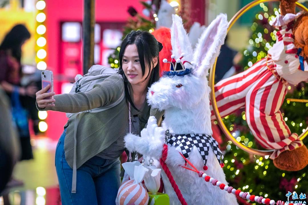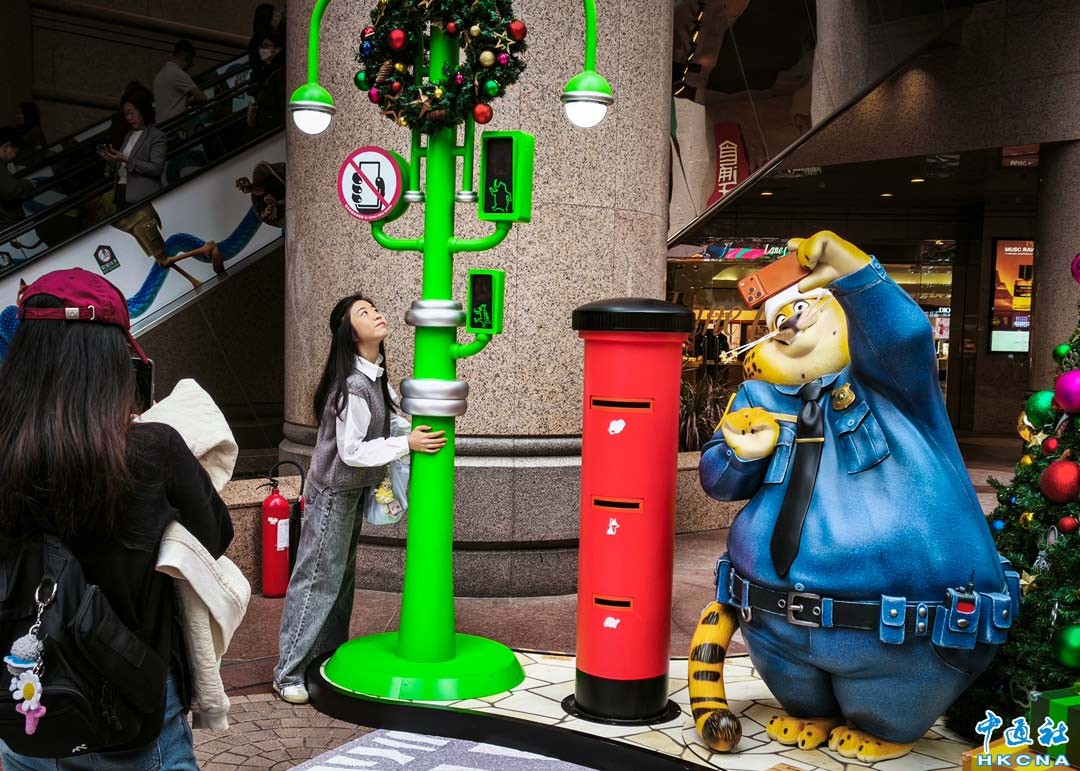 聖誕節即將來臨,香港各區布置節慶裝飾,銅鑼灣商圈有遊客打卡拍照。銅鑼灣時代廣場聖誕新年期間以超人氣動畫電影《優獸大都會2》為主題,以1:1人偶造型現身,重現經典電影場景,場內更有4.8米高聖誕樹,洋溢濃厚節日氣息。 (香港中通社記者 洪少葵 攝)
