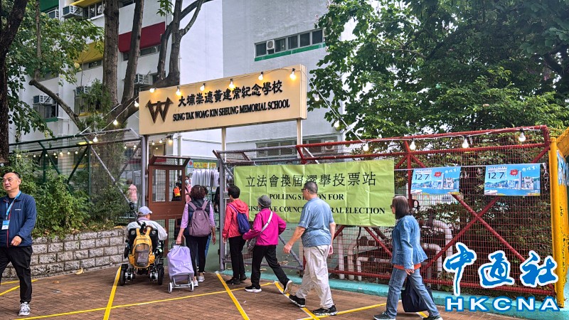 12月7日,香港立法會選舉投票日,大埔區的投票點設在大埔崇德黃建常紀念學校,現場市民絡繹不絕,有全家老小一起前來投票。 (香港中通社記者 陳爍 攝)