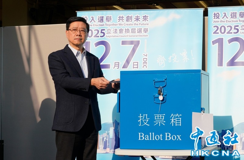 12月7日,香港第八屆立法會選舉投票日。全港設600多個票站,開放予約413萬名已登記選民投票。選民將在161位候選人中投出90位新立法會議員。圖為香港行政長官李家超到高主教書院投票站投票。(香港中通社記者 陳奕啟 攝)