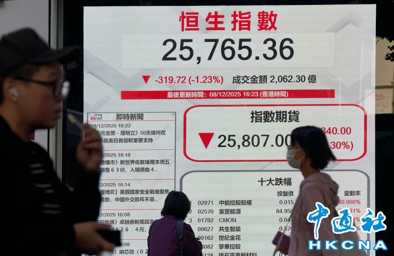 香港中通社12月8日電(記者 徐嘉儀)港股8日低開低走,恒生指數收市報25765點,跌319點。大市成交額為2062億港元。