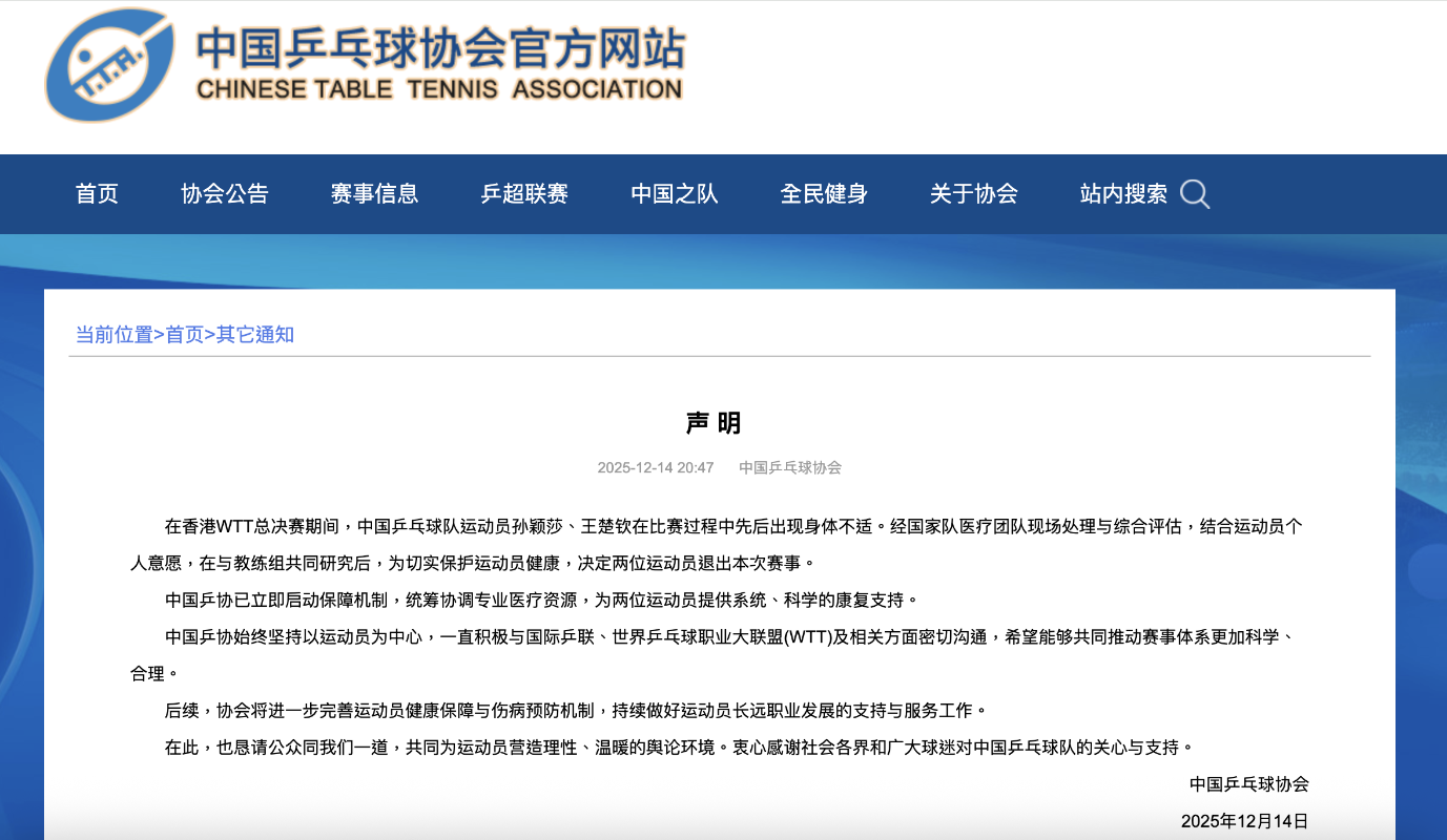 香港新聞網12月14日電 中國乒乓球協會14日晚發佈聲明,指在香港WTT總決賽期間,中國乒乓球隊運動員孫穎莎、王楚欽在比賽過程中先後出現身體不適。經國家隊醫療團隊現場處理與綜合評估,結合運動員個人意願,在與教練組共同研究後,為切實保護運動員健康,決定兩位運動員退出本次賽事。