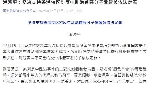 香港新聞網12月15日電  香港特區高等法院於15日作出裁決,壹傳媒創辦人黎智英涉嫌兩項串謀勾結外國勢力罪、一項串謀發布煽動刊物罪全部成立。這是司法機構依法、公正、公開作出的裁決,充分體現香港的法治精神,有力維護了香港的國家安全,廣大香港市民對此拍手稱快。香港新聞聯堅決支持高等法院此次裁決,堅定支持香港特區履行維護國家安全的憲制責任。