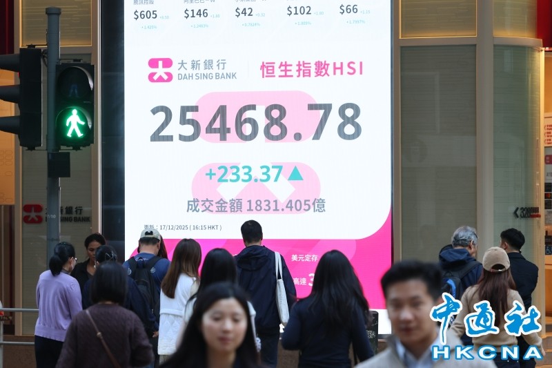 香港中通社12月17日電(記者 張明臻)港股17日高開,跟隨A股走勢反覆向好,扭轉過去兩日頹勢。恒指17日收報25468點,升233點或0.92%;大市全日成交1831億港元。