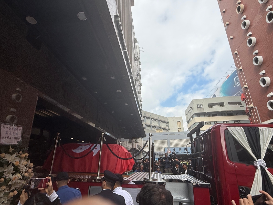 香港新聞網12月19日電(記者 譚暢)香港消防處19日在九龍紅磡世界殯儀館為已故消防隊目(追授)何偉豪舉行最高榮譽喪禮。何偉豪靈柩蓋上特區區旗,抬上消防靈車。多名市民到殯儀館外悼念。