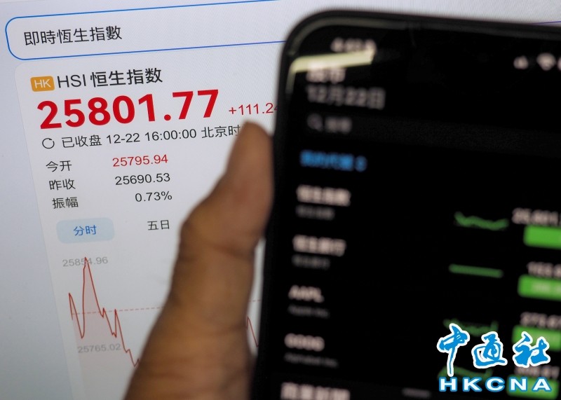 香港中通社12月22日電(記者 梁嘉軒)市場關注投資人對人工智能板塊的情緒回溫,美股上周五表現造好,並帶動滬深兩市,港股22日連升四個交易日,當天恆生指數收報25801點,升111點。