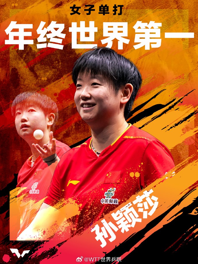 男子單打年終世界第一:王楚欽 圖源:WTT微博 女子單打年終世界第一:孫穎莎(中國)
