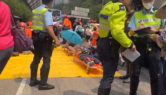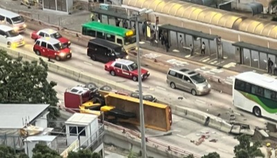 香港新聞網12月27日電 香港一輛重卡27日下午近1時在將南隧道往將軍澳方向發生交通意外,涉事重卡在一處彎道側翻,撞向隧道牆板,部分牆體散落。