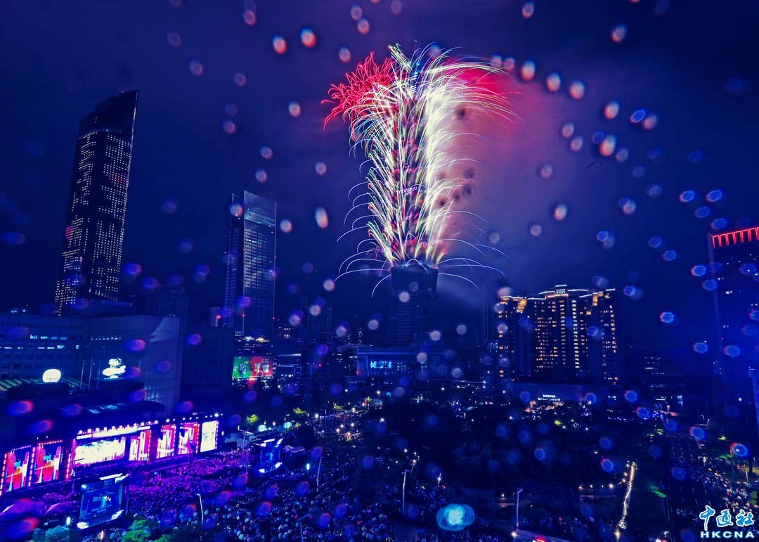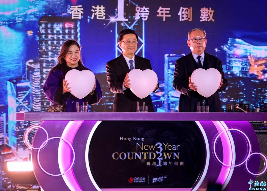 1月1日凌晨,香港跨年倒數活動踏入高潮,香港特別行政區行政長官李家超與文化體育及旅遊局局長羅淑佩、旅發局主席林建岳一同主持倒數啟動儀式,中環8幢地標建築上演精彩的光影表演,標誌著2026年的正式到來。圖為中環上演光影表演。香港特別行政區行政長官李家超(中),文化體育及旅遊局局長羅淑佩(左),旅發局主席林建岳(右)主持儀式。(香港中通社記者 鄧梓傑 攝)