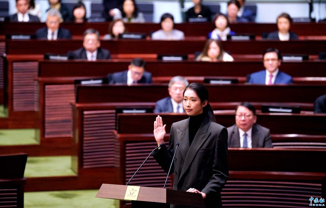 1月1日上午11時,香港特區第八屆立法會候任議員宣誓儀式於立法會綜合大樓會議廳舉行,由行政長官李家超為議員監誓。圖為江旻憓宣誓(中通社記者 陳奕啟 攝)