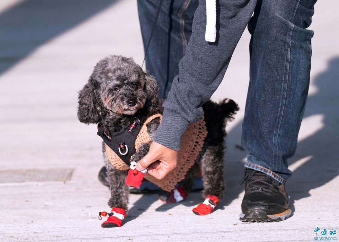 1月3日,截至早上7時30分,香港天文台錄得最低氣溫11.4度,是入冬以來的最低紀錄。新界多區氣溫介乎8度至9度,北區打鼓嶺只有5.3度,大帽山4.1度,日間最高氣溫大約17度。圖為遛狗市民為狗狗換上禦寒衣物。(香港中通社記者 陳奕啟 攝)