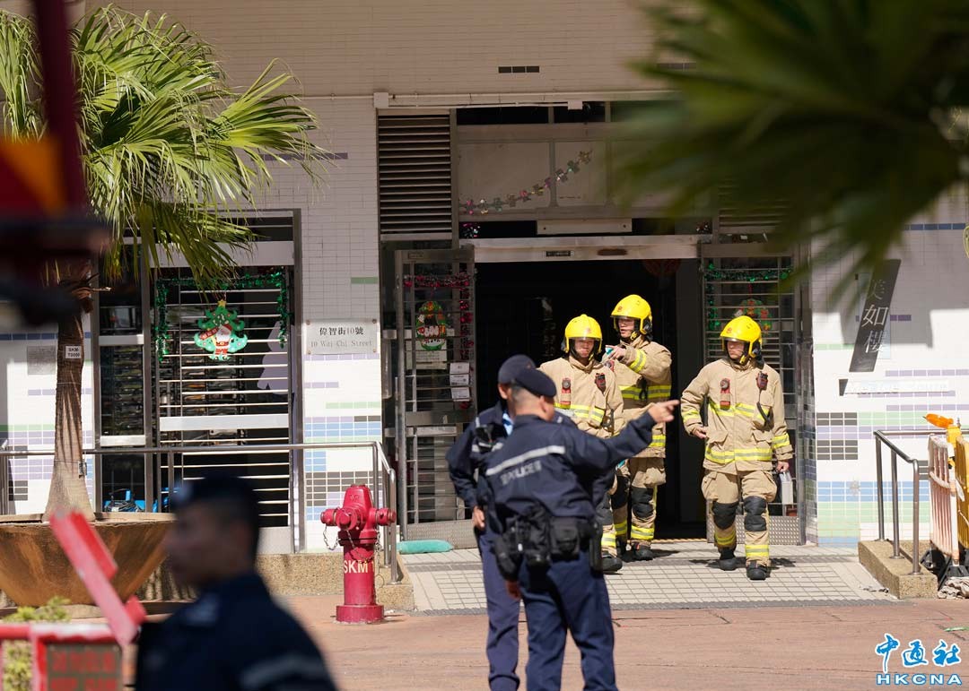 1月4日,香港石硤尾邨美如樓早上發生火警,警方、救護車及消防員接報到場疏散逾200居民。消防出動一條喉及一隊煙帽隊灌救,其後將火救熄。初步知道造成1死8傷,分別送往明愛醫院及廣華醫院治理。圖為大批消防車到場救援。(香港中通社 陳奕啟 攝)