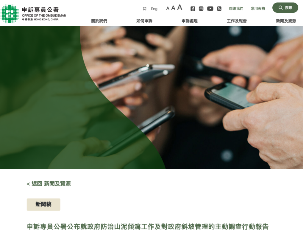 圖片來源:香港申訴專員公署網站截圖 申訴專員公署是根據香港法例成立的獨立法定機構,主要職權是監察各政府部門和主要公營機構的公共行政。 香港2015年至2024年每年錄得平均約214宗山泥傾瀉事故,當中超過四成涉及政府人造斜坡,涉及私人人造斜坡的則約為5%。 報告說明,政府人造斜坡的數量顯著高於私人人造斜坡,因此涉及政府人造斜坡的事故數字較高,屬可以理解。然而,撇除兩類人造斜坡的實際事故數目差異後,公署發現,在2020年至2024年,政府人造斜坡發生山泥傾瀉事故的比率仍高於私人人造斜坡,相差介乎1至3倍不等。此外,公署發現部分斜坡在首次發生事故起計3年內重複發生事故。 調查報告建議,特區政府土木工程拓展署應繼續關注和審視政府人造斜坡與私人人造斜坡的事故比率是否出現重大差異,並了解原因,以及在有需要時制訂合適的應對措施;此外,各相關部門可透過土拓署正在建立的中央斜坡維修資料庫,掌握最新的斜坡維修狀況、分享常見的維修保養問題、評估暴雨對斜坡的影響。(完) 【編輯:林曉惠】