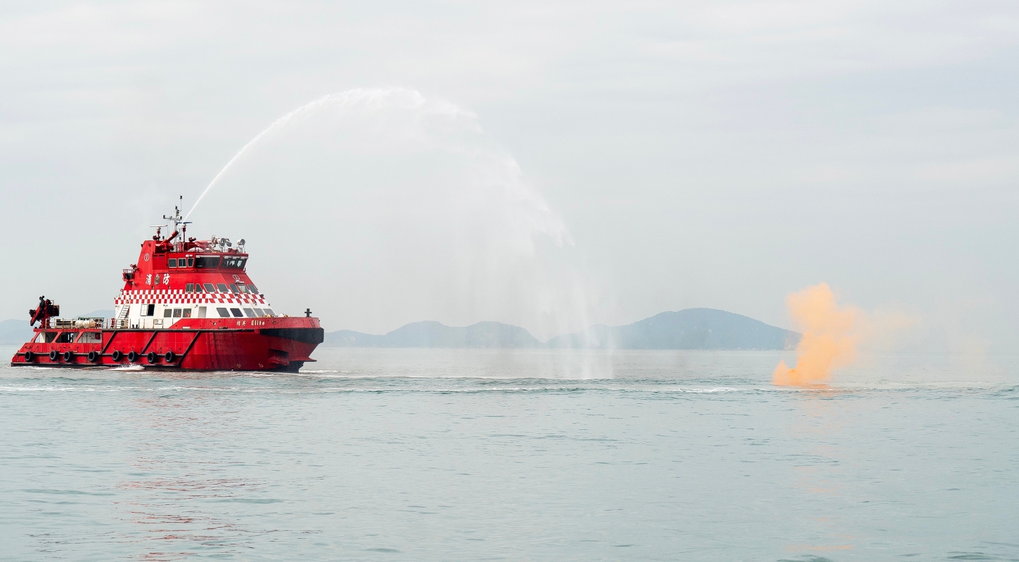 演習模擬直升機墮海後起火,消防處派出消防船在海上射水撲救。
