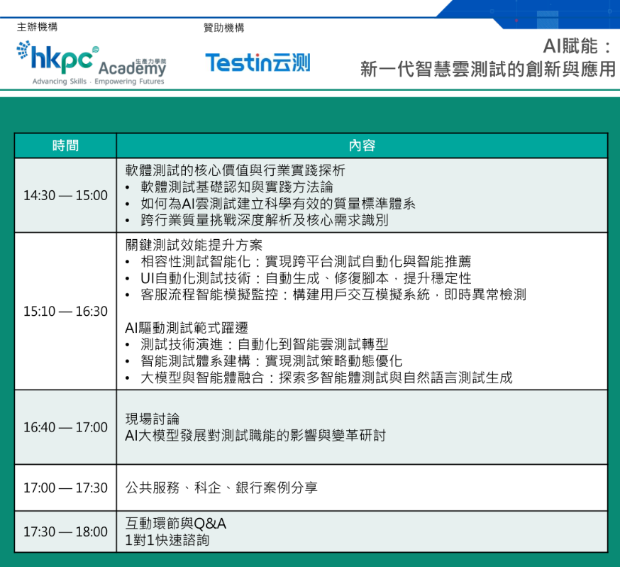 活動核心價值:高含金量沙龍的核心優勢 本次活動專為香港企業決策層及技術管理層量身打造,僅開放20個參與名額,聚焦高品質精準對接。其核心價值體現在以下三方面: 1. 效能升級:從“指令碼編寫”到“AI自修復”:沙龍將現場展示如何運用電腦視覺(CV)與大模型語義理解技術,實現測試系統的自主修復功能。當應用程式介面發生調整時,AI將自動識別控制項位置變化,同步更新測試邏輯,無需人工逐句修改指令碼。這一模式將顯著提升指令碼穩定性,釋放人力投入核心架構優化工作。 2. 跨端相容:雲端實機併行測試:針對香港金融機構對系統穩定性的零容忍要求,Testin雲測將分享如何通過雲端呼叫數千部實機,開展併行測試工作。AI不僅可自動執行測試流程,還能同步分析日誌數據,精準定位特定機型的崩潰問題,為相容性優化提供明確方向。 3. 典範革新:邁入智慧體測試(Agentic Testing)時代:本次沙龍的核心亮點是對智慧體測試(Agentic Testing)的深度探討。不同於傳統固定指令式測試,智慧體測試模式下,僅需向AI下達核心目標(如“完成開戶流程全鏈路測試”),AI智慧體便可模擬真人操作邏輯,自主探索應用場景、生成測試案例。這種“無人化自主測試”模式,將推動測試工作實現本質性轉型。 實戰案例:落地成果印證技術價值 沙龍將分享多個在香港及內地具有高度參考價值的實戰案例,以真實成效驗證AI測試的應用價值: · 銀行業案例:某大型銀行在推出新功能時,面臨百餘款手機機型的適配難題。通過Testin雲測的AI測試方案,原本需要一週完成的測試工作縮短至數小時,同時精準定位並修復多個隱藏極深的交易類漏洞,成功規避了上線後可能引發的公關危機。 · 公共服務案例:某政府相關應用程式需頻繁迭代更新,通過部署AI智慧流程監控系統,實現24小時不間斷模擬市民操作場景,一旦發現系統異常立即觸發報警,真正實現“事前預防、主動防控”。 · 科技企業案例:分享如何將AI測試技術嵌入持續整合/持續部署(CI/CD)開發流程,在程式碼提交前便完成風險預判,精準識別高風險模組,從源頭提升產品品質。 議程精華:專家現場破解測試瓶頸 本次沙龍議程由淺入深、重點突出,全程聚焦實戰應用。活動初期,Testin雲測專家將幫助與會者重塑測試思維,摒棄傳統低效測試模式,建立AI時代的品質檢測標準。隨後,將深入核心技術環節,圍繞UI自動化測試、智慧相容性測試、AI客服功能監控等關鍵場景,逐一拆解技術應用方案,助力企業將高成本、高風險的測試環節全面升級為AI驅動模式。 沙龍後半程將聚焦行業實踐,由專家帶領與會者梳理金融及政務領域的測試實踐經驗,深入探討AI技術對品質檢測崗位的重塑作用。值得關注的是,活動尾聲將設置30分鐘的“一對一快速諮詢”環節,與會者可攜帶企業實際面臨的技術難題及漏洞案例到場,專家將現場進行深度診斷分析,並提供針對性解決方案,確保每位參與者都能帶走可落地的實戰經驗。 在當前AI技術快速迭代的浪潮中,軟件產品品質的穩定性直接決定企業核心競爭力。對於香港企業而言,智慧雲測試不僅是降本增效的重要手段,更是維護企業品牌聲譽的關鍵保障。本次沙龍全程免費,旨在為香港IT領域企業提供高品質的技術交流與資源對接平台。建議企業決策層及技術管理層抓緊時間報名,藉助2026年初的發展契機,完成品質檢測系統的升級迭代,為全年業務發展築牢基礎。 (完) 【編輯:張明臻】