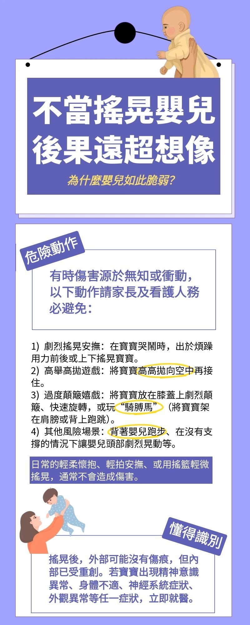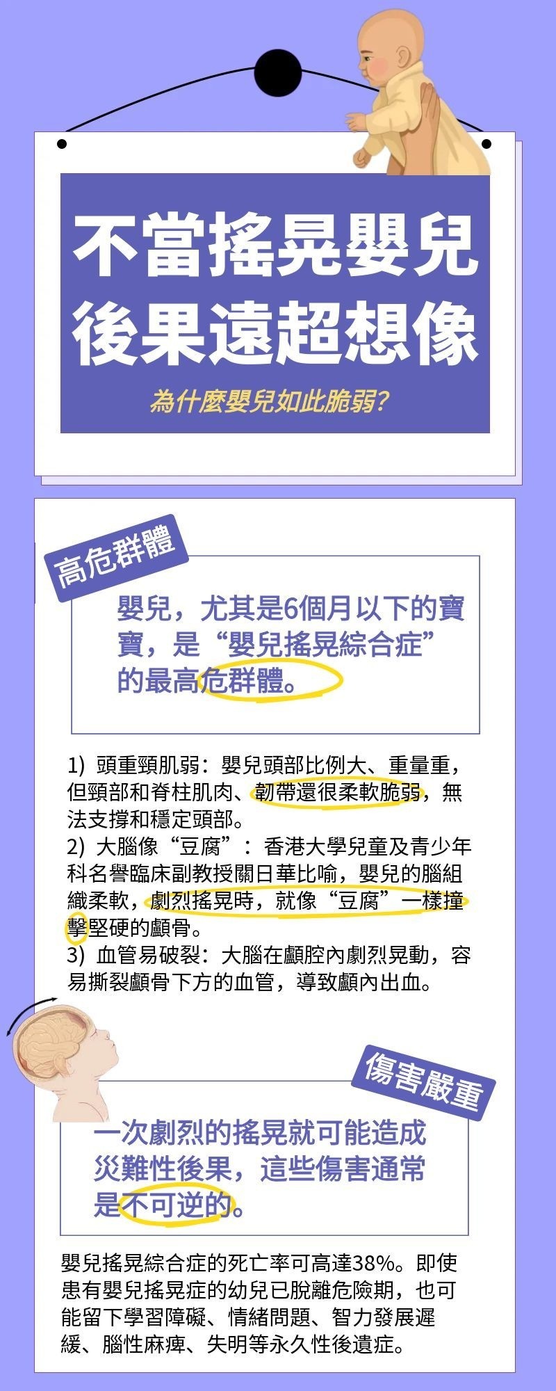 香港新聞網1月22日電 看似無關的賽場與家庭,潛藏著同一致命風險。近期兩起牽動香港社會的事件,共同揭示了不當搖晃對嬰兒造成的嚴重威脅。賽場上,近日渣打香港馬拉松賽事期間,有一名男子胸前孭着嬰兒參賽;家庭中,四個月大男嬰疑遭搖晃叉頸致腦出血。這兩起性質不同的事件,指向同一個被廣泛忽視的育兒常識:嬰兒頭部劇烈搖晃,可能瞬間造成不可逆的終身傷害。 前者或許源於對風險的認知盲點,後者則涉嫌故意虐待。無論起因如何,後果同樣沉重。這份懶人包清晰說明“嬰兒搖晃綜合症”的風險、識別方法與正確安撫技巧,守護每個脆弱的小生命。