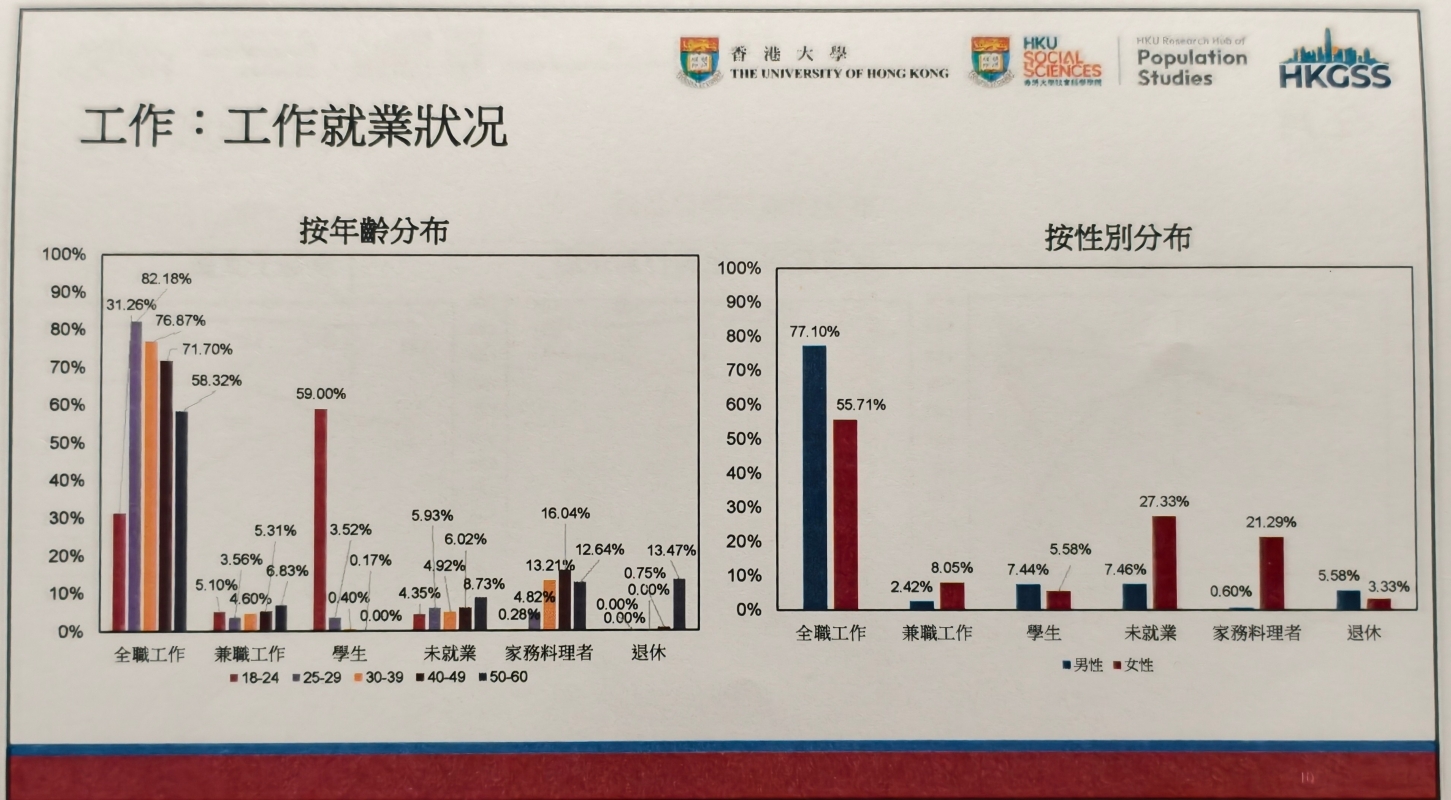 翻攝自香港大學簡報 樓瑋群在發佈會上表示,香港勞動力市場以全職就業爲主,男性(77.1%)及25至49歲人群(≥71.7%)的全職就業比例最高;全職就業者平均每周工作時長達46小時或以上,表明各年齡群體普遍處於較高的工作投入水平;未就業者大多爲女性;以及就業狀態與自評健康、幸福感、抑鬱程度的關係。