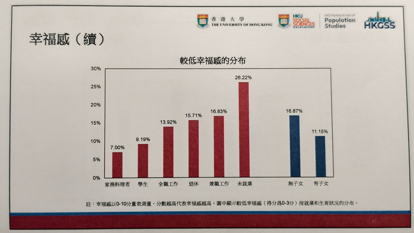 翻攝自香港大學簡報 她進一步分析,幸福感相對較低的群體,同樣是未就業者;不同年齡段的未就業者均普遍對自身健康狀況評價較低,幸福感也隨之偏低。 至於抑鬱程度更高的群體,同樣是未就業者。她指出,種種不利因素或會疊加。(完) 【編輯:梁嘉軒】