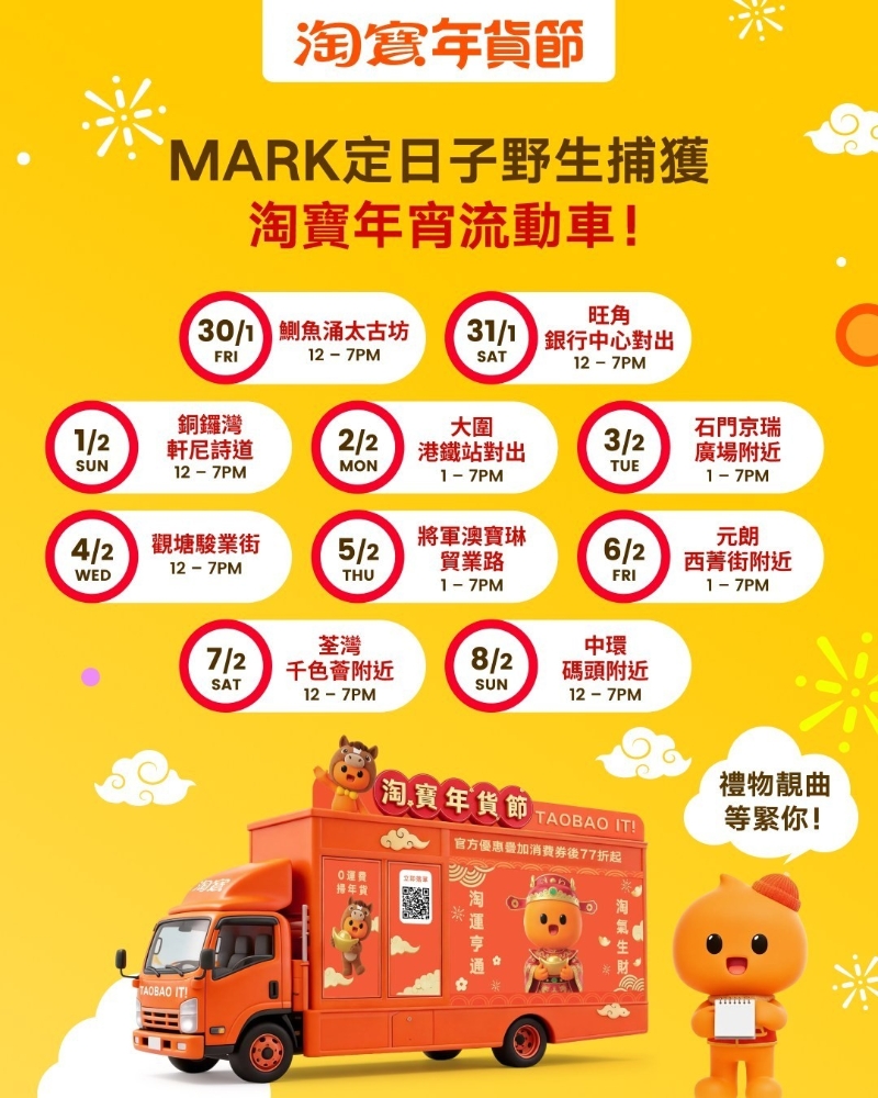 香港新聞網1月30日電   農曆新年將至,1月30日起,淘寶準備走遍香港各區給市民拜早年、送大禮。此外,淘寶推出年貨節官方優惠券,使用立享77折起,優惠即日起至2月11日23:59。