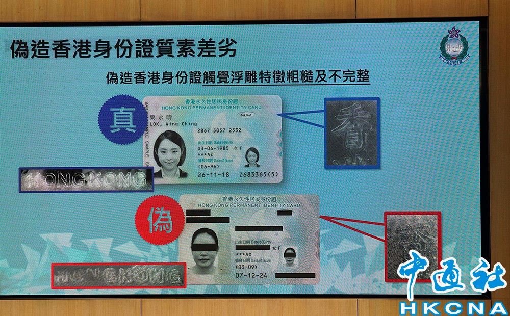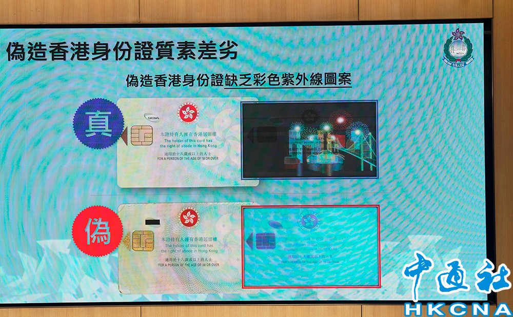 偽造香港身份證缺乏彩色紫外線圖案 鄧家輝指出,涉案偽證造工粗劣,欠缺多項防偽特徵。入境處將繼續與內地執法部門加強合作,打擊整條犯罪鏈,保障本地就業機會及維護社會秩序。 【編輯:陳奕啟】