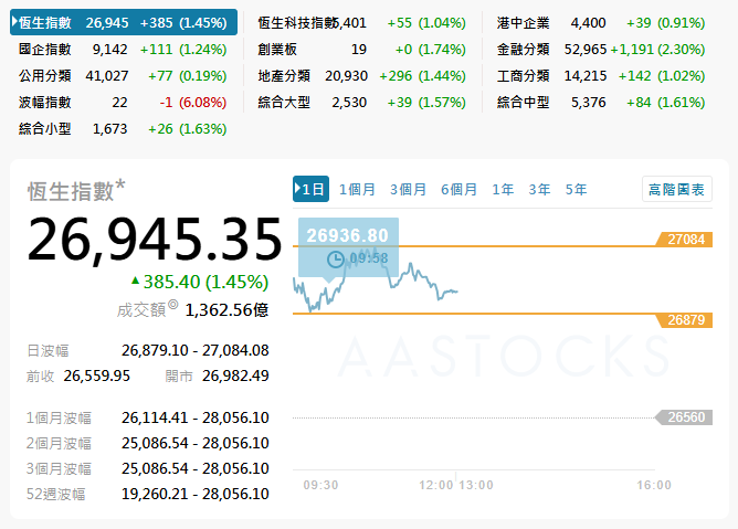 港股9日中午收市報26945點 升385點