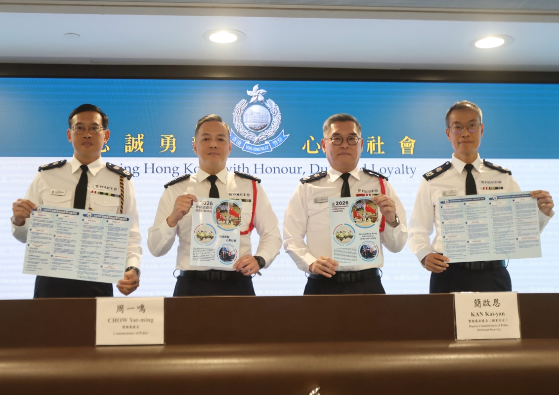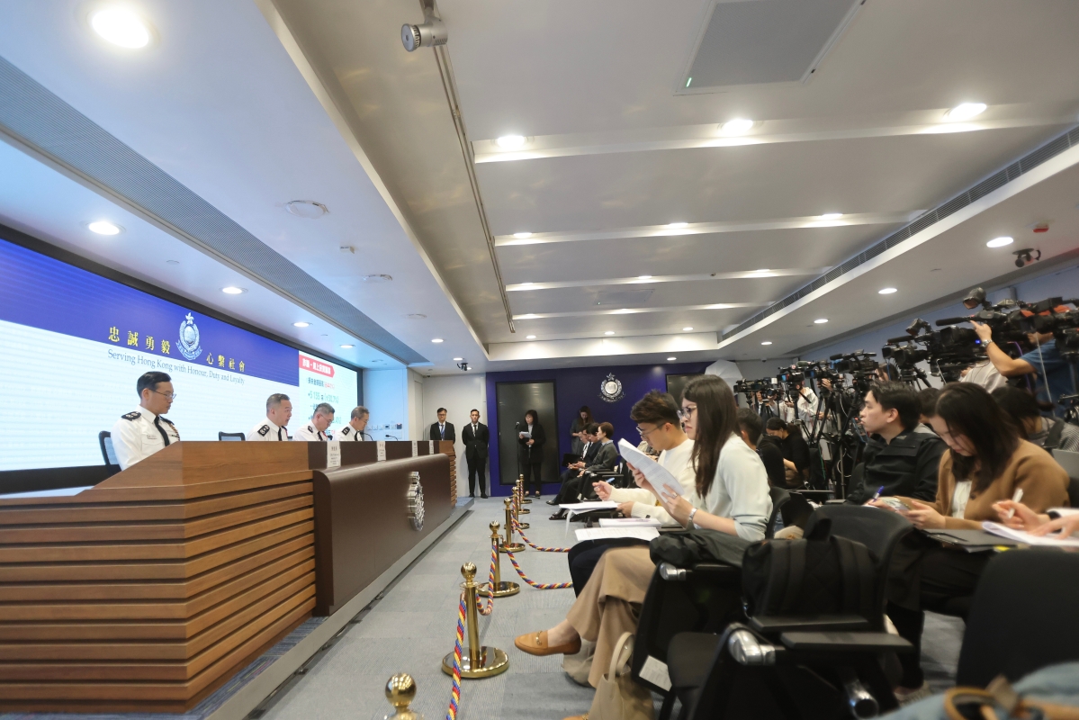 圖為香港警務處處長周一鳴(左二)、警務處副處長(國家安全)簡啟恩(右二)、副處長(管理)陳俊燊(左一)及副處長(行動)葉雲龍(右一)出席記者會。