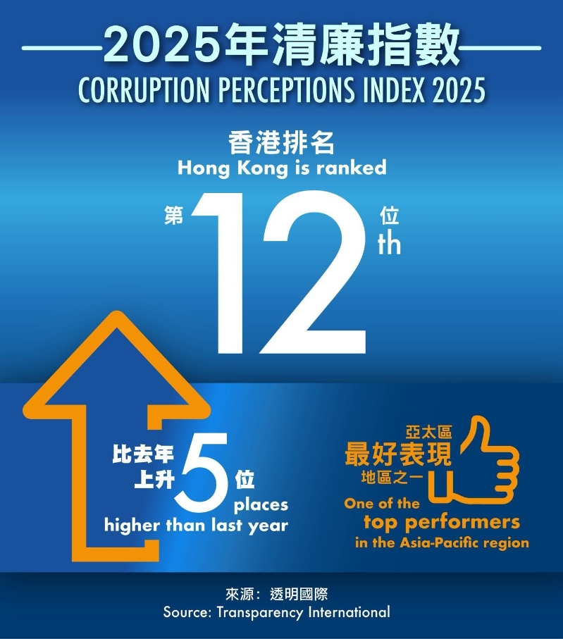 香港新聞網2月12日電 國際反貪組織“透明國際”公佈的最新調查中,香港廉潔度在全球182個國家/地區中排行第12位,較上一年排名上升五位,錄得自1995年首次公佈以來,最大升幅排名之一,亦是亞洲區第二名。