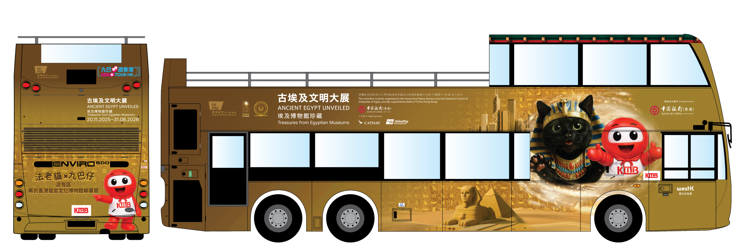 香港新聞網3月4日電 香港故宮文化博物館與九龍巴士(一九三三)有限公司(九巴)合作,由3月7日(星期六)起,聯乘推出期間限定“九巴法老貓號”一共10輛主題巴士,延續特別展覽“古埃及文明大展──埃及博物館珍藏”(“古埃及文明大展”)的熱潮。在“九巴法老貓號”上,“古埃及文明大展”人氣角色“法老貓”將與深受市民喜愛的“九巴仔”結伴同遊九巴多條連接西九文化區的旅遊路線,以輕鬆趣味的方式把古埃及文化體驗延伸。 “九巴法老貓號”將於3月7日起正式投入服務,為期一個月,10輛主題巴士將分別行走於途經西九文化區的路線,包括“九巴遊香港”HK1開篷巴士、上月開辦連接西九文化區的“寵物巴士團”、W4 [ 高鐵(西九龍站)⇋ 尖沙咀(循環線)] 及296D [ 尚德 ⇋ 九龍站 ]。“九巴法老貓號”披上古埃及主題車身設計,除了生動展現兩位可愛小主角“九巴仔”與“法老貓”, 更融入金字塔、藍色河馬、獅身人面像及聖書體符號等文化元素。 10輛主題巴士的車廂內亦增設主題貼紙及椅背展示,以趣味方式連結香港的文旅特色與古埃及文物,從飲食文化、傳統習俗及文字書寫等角度,對照古埃及文化與香港日常生活,帶領乘客在旅途中探索文化小知識, 展開一段輕鬆且富啟發性的文化之旅。