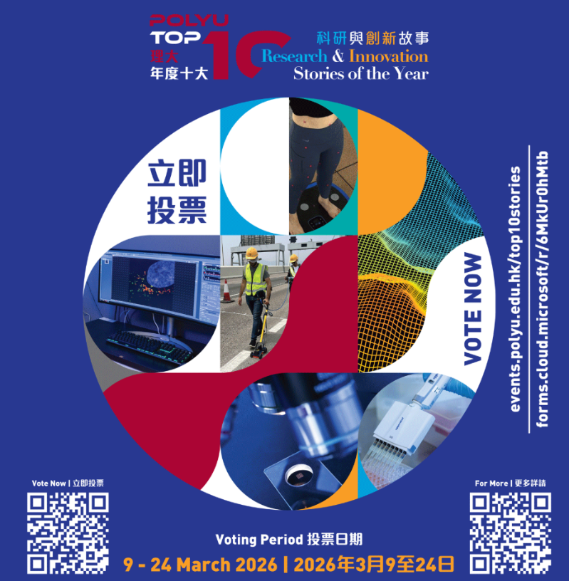 理大表示,一直秉持“致力於世界領先的研究及創新,以貢獻社會”的使命,深耕跨學科尖端科研,積極將研究成果轉化為創新有效的解決方案,為香港乃至國家可持續發展作出貢獻。是次活動旨在讓為社會各界深入瞭解本地大學科研實力與創新價值,進一步提高社會對科研創新的關注度,同時支持默默耕耘、為社會帶來深遠且具影響力的科研人員,匯聚力量,推動香港創科發展再上新里程。理大已發布了2025年度的20個入選故事,涵蓋先進製造、材料科學、人工智能和數據科學、生命科學及醫療保健、藥物研發及診斷、智慧城市、環境及可持續發展、能源儲存及效率等範疇。 “理大2025年度十大科研與創新故事”名單將由公眾投票及專業評審共同決定,結果將於3月31日於理大官網及社交媒體平台公布,指定里程碑投票者有機會獲得 iPad 及唯港薈米芝蓮一星餐飲體驗。 最終“十大科研與創新故事”名單將由公眾投票結合專業評審決定,並特別表彰獲得公眾投票數最高的前三個故事。結果將於3月31日透過理大官網、研究及創新事務處網站及社交媒體平台正式公布,投票者(每人限投一次)有機會獲得豐富獎賞,包括iPad及唯港薈(Hotel ICON)米芝蓮一星餐飲體驗。 投票日期:即日至3月24日 結果公布:2026年3月31日 投票獎賞:https://polyu.me/40Pz4I1 (完) 【編輯:譚暢】