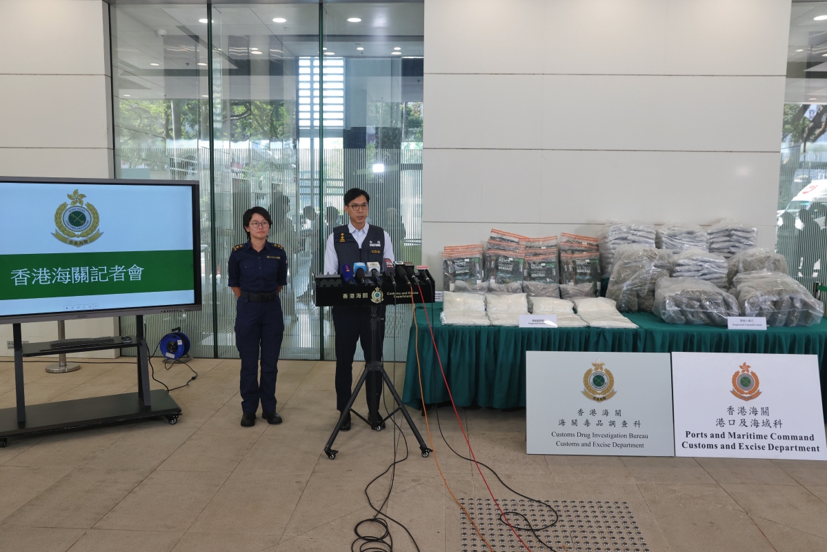 香港海關毒品調查科毒品調查第二組高級調查主任趙啟榮和海關港口及海域科貨櫃貨物檢查組督察劉芷欣在講述案件詳情。