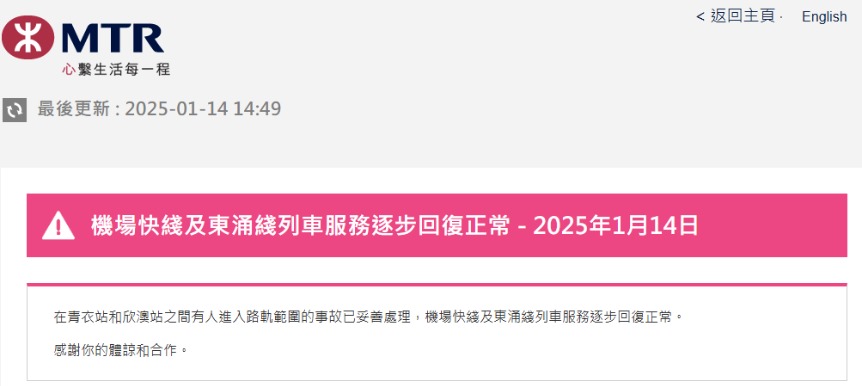 據悉,初步資料顯示,一輛東鐵列車由九龍塘站前往大圍站途中,車尾駕駛室的緊急出口斜道被人打開。 東鐵綫其他路段維持服務,但班次有所調整。其中來往金鐘至旺角東站8分鐘一班車;來往大圍至羅湖站8分鐘一班車;來往大埔墟至落馬洲站為12分鐘一班車。 港鐵免費接駁巴士現正來往九龍塘至大圍站。因應東鐵服務受阻,城巴現正加強79號線服務,便利乘客於下午繁忙時間往返大圍、沙田市中心及大埔。 (完) 【編輯:譚暢】