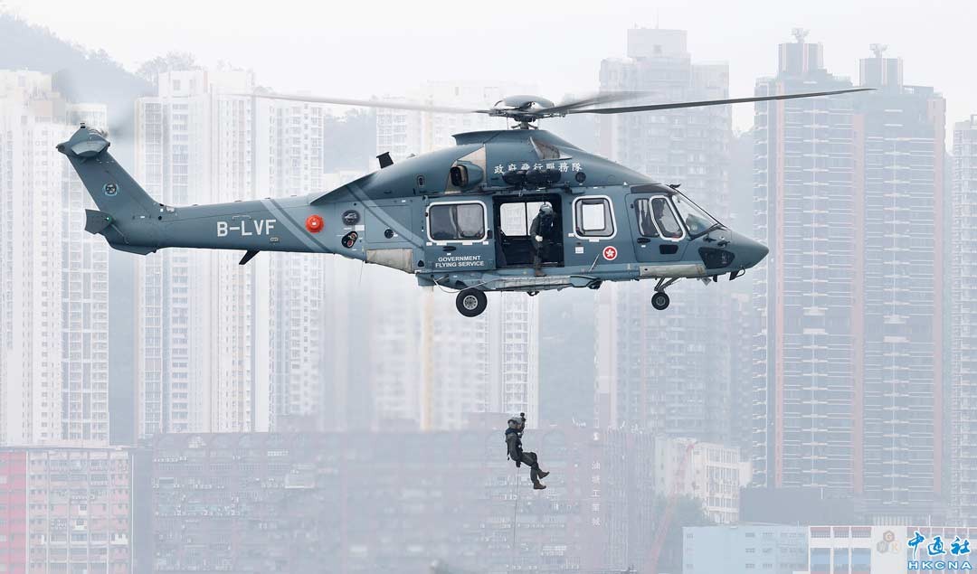 3月29日,香港政府飛行服務隊舉行開放日,同日成立“政府飛行服務隊航空啟導國際學院”。圖為政府飛行服務隊搜救表演。(香港中通社記者 陳奕啟 攝)